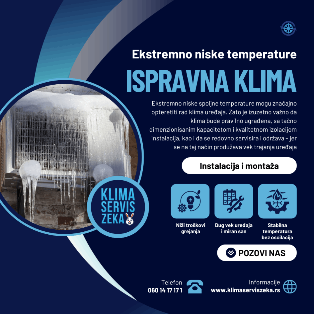 Ekstremno niske temperature mogu ozbiljno opteretiti rad klima uređaja – ali uz pravilnu ugradnju i redovno održavanje, vaša klima radi stabilno, tiho i efikasno tokom cele zime!